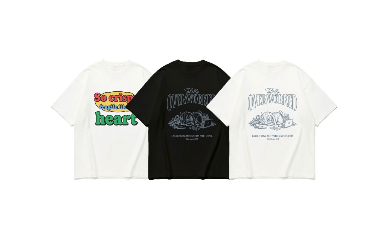 This drop balances humor and honesty — from “So Crispy, fragile like my heart” to “Totally Overworked,” every tee carries a story we all secretly live. One’s about love that breaks like snacks, the other about burnout disguised as productivity.